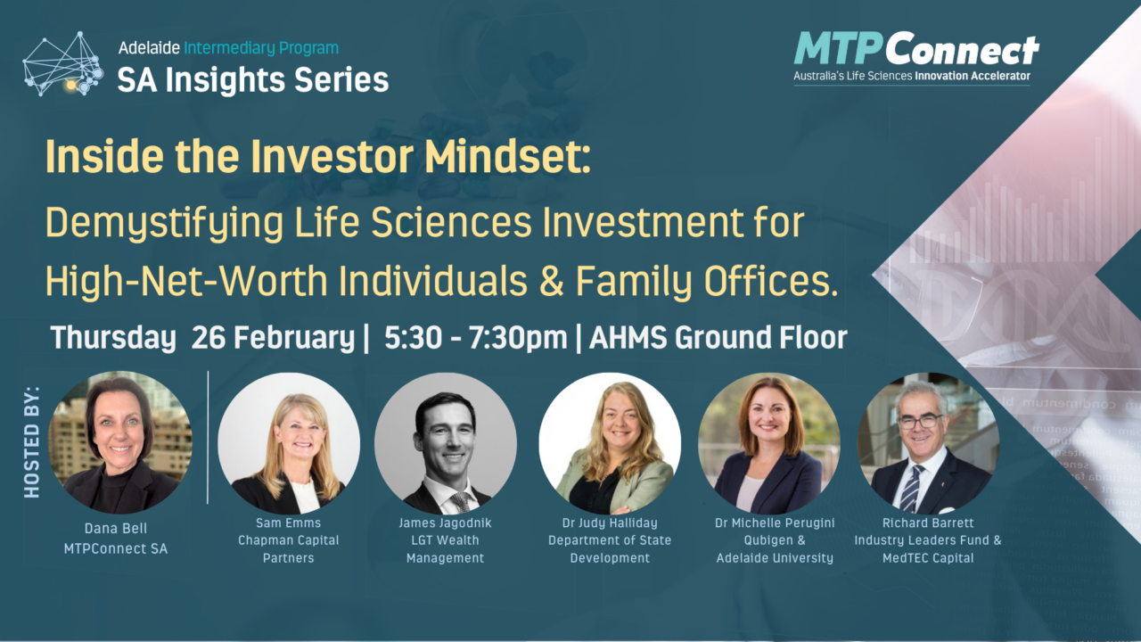 Join Adelaide Intermediary Program Director, Dana Bell for an SA Insights fireside chat and networking evening exploring how high-net-worth individuals (HNWI) and family offices invest, including in life sciences — and what sets them apart from other sources of capital.