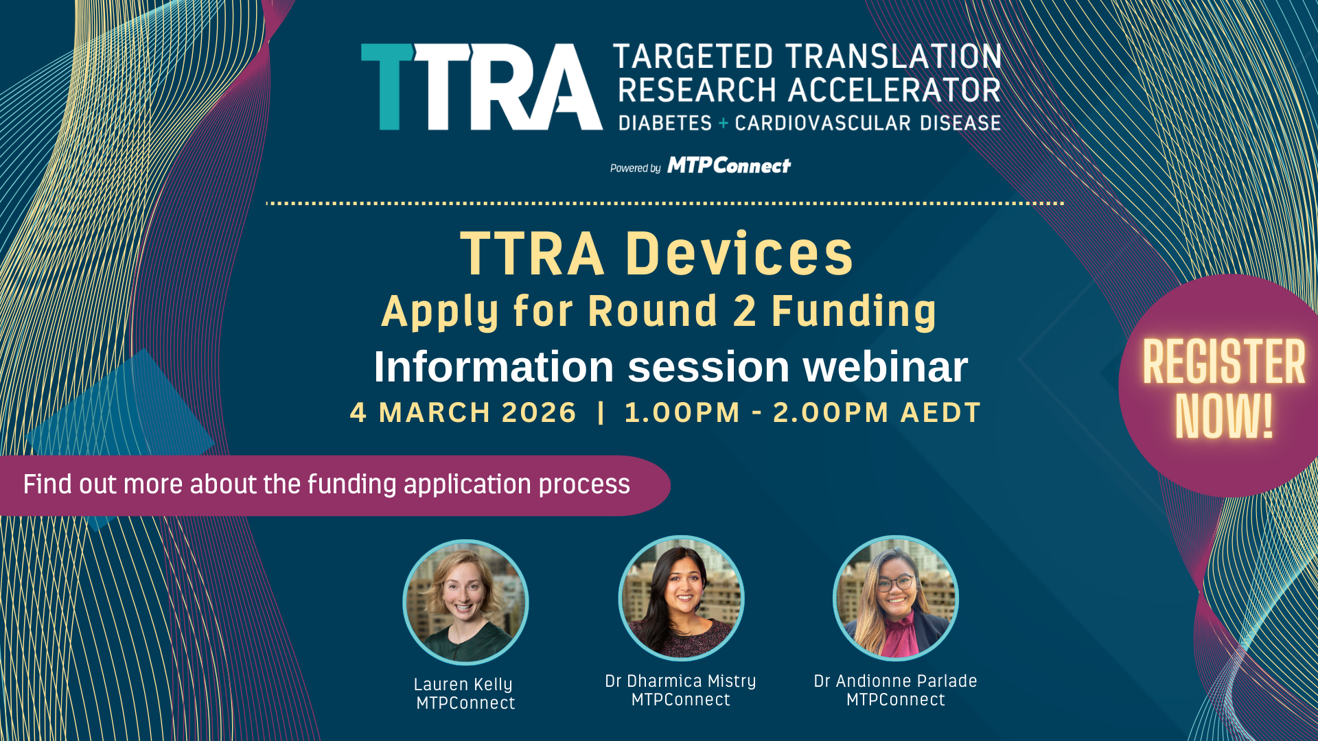MTPConnect’s TTRA Drugs and Devices program aims to accelerate the development and commercialisation of promising drugs and medical devices into products that can reduce the burden of cardiovascular disease and complications of diabetes for patients, carers, families, and community. In 2025, MTPConnect awarded funding to the first TTRA Drugs & Device cohort.