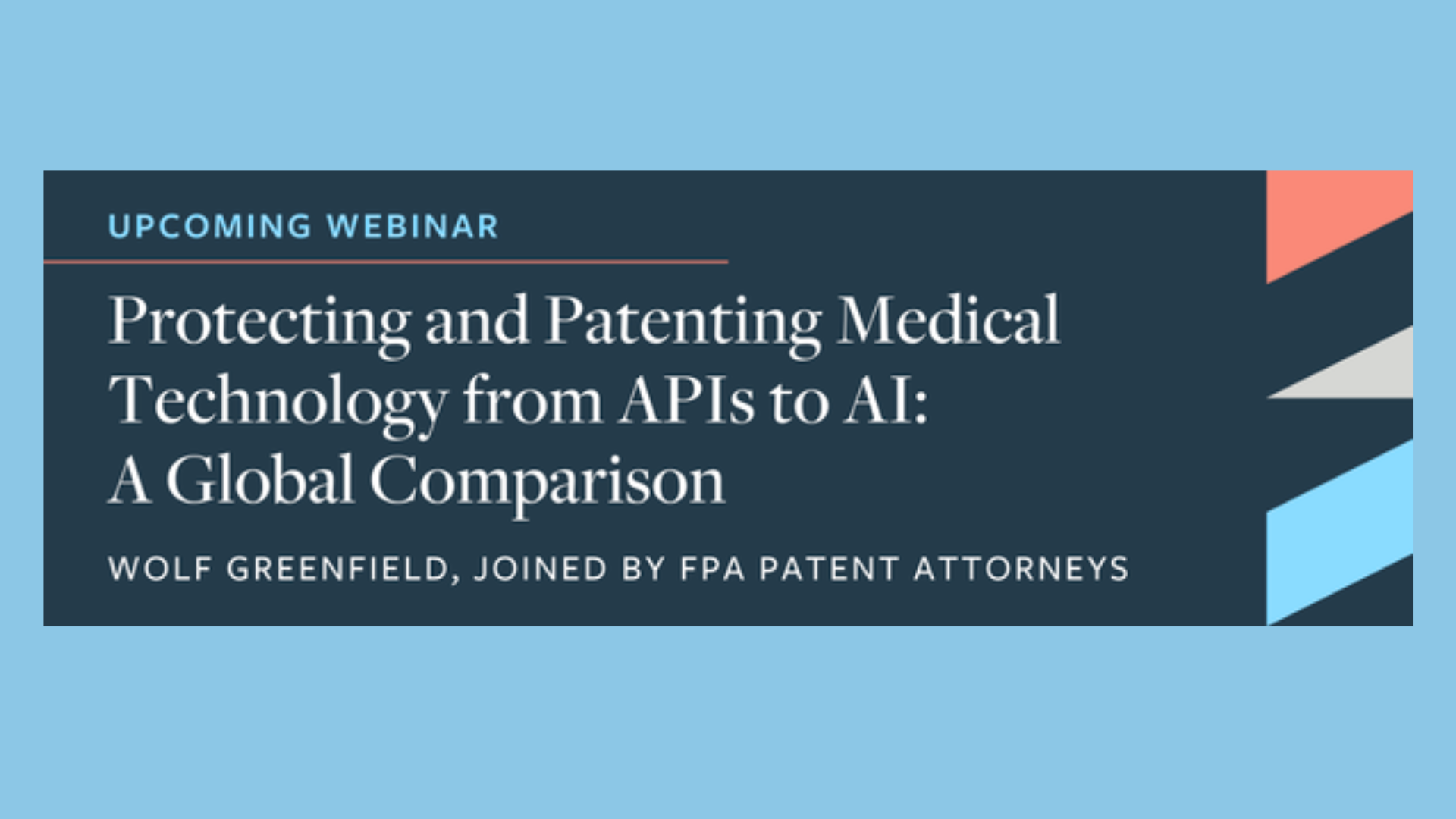 Join Wolf Greenfield and FPA Patent Attorneys for a live, interactive Q&A session on how to protect medical technology IP across key global markets, including the US and Australia. Our panelists will address what you can and cannot do in different jurisdictions, common pitfalls that put valuable patents at risk, and practical steps you can take now to better safeguard your innovations internationally. Submit your questions in advance or ask live, and leave with practical guidance tailored to your medical technology portfolio and growth plans.