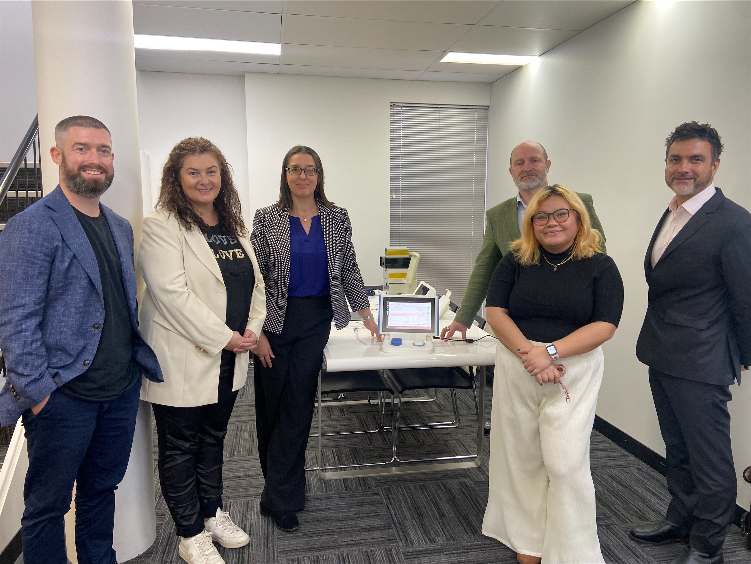 The CTCM team with Dr Lee Hubble, Celine Royet, and Dr Julian Shapley with the prototype DelivAssure™ device at VitalTrace’s facility in Perth.