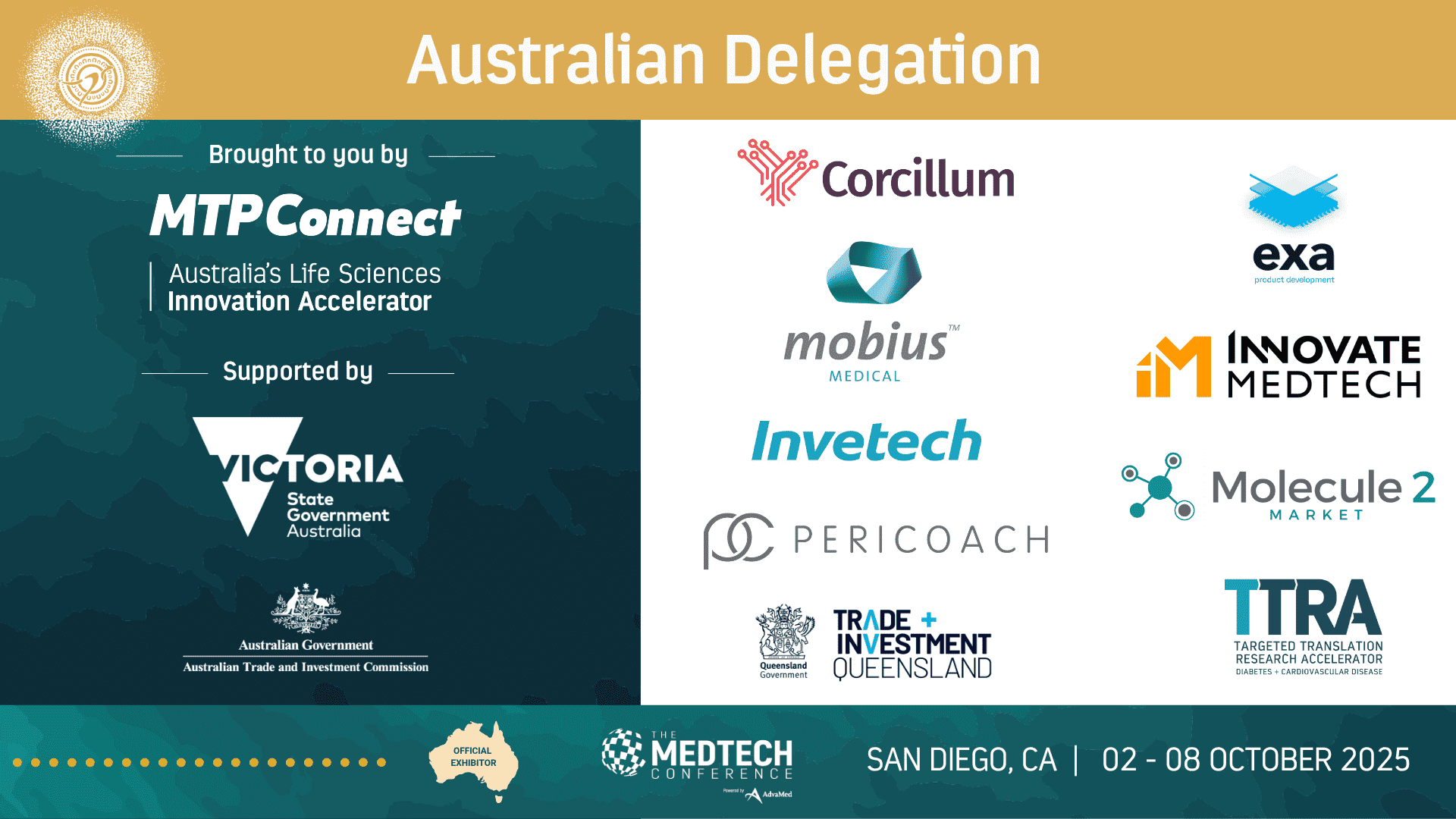 We announced the Australian companies and organisations taking part in our medtech delegation to The MedTech Conference in San Diego in October, to open-up new US market, commercial and collaboration opportunities. Delegates include: Corcillum Pty Ltd, Exa Product Development, Innovate Medtech, Mobius Medical, Molecule2Market, Pericoach, Trade and Investment Queensland and Targeted Translation Research Accelerator with support from Austrade and the State Government of Victoria. Find out more in our Trade Mission Directory.