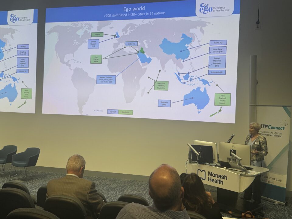 Ego Pharmaceuticals‘ CEO Jane Oppenheim shared the global success story of this iconic Australian-owned company developing, manufacturing and marketing innovative skincare products since 1953, including QV skincare and Aqium hand sanitiser. With 47 therapeutic products listed on the ARTG, Jane’s gave us insights into the challenges of advanced manufacturing (at nearby site in Braeside) and navigating health procurement at scale in Australia and globally.
