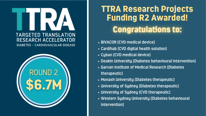 The TTRA program, a Medical Research Future Fund initiative delivered by MTPConnect, is supporting new approaches to improve the prevention, diagnosis, treatment and management of diabetes, cardiovascular disease and their related complications.